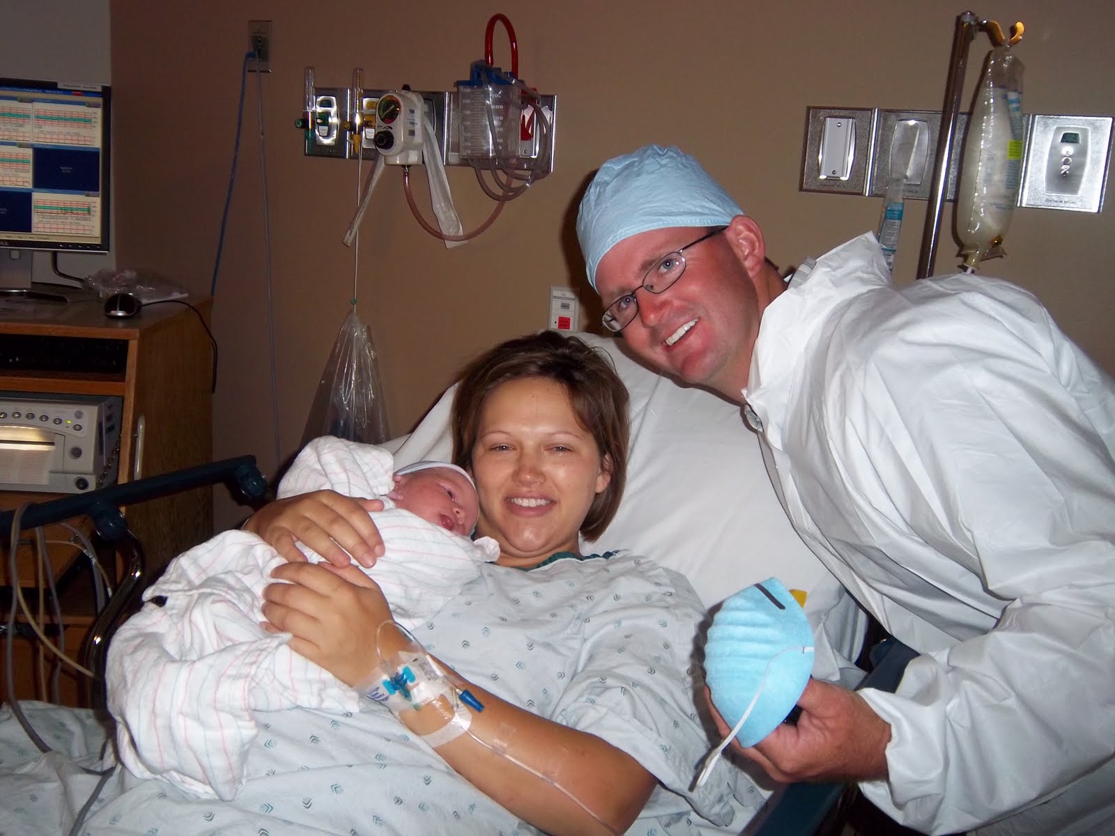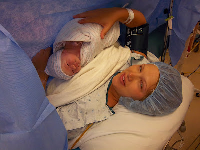 Here we are ready and waiting to go down to the OR. I was getting pretty nervous since the doctor was going into extreme detail about all the risks of surgery. They did my bloodwork and found that my platelet count was low. My count was 101 and if it had been 100 or lower I would of had to go to sleep for surgery. That was pretty scary to hear. But since I didn't want to stay pregnant forever, I opted for the surgery. They wheeled me down and had Jeremy wait outside while they prepped me. They hadn't even layed me down on the table and I was already crying. The doctor went to work on me. It seemed like forever that they were cutting, and pushing and pulling on me. Then they got the head out, and Jeremy said he thought, "Uhh oh, that looks like a boy head", but then they pulled the baby out and announced it's a girl! It was almost like a scene out of a movie, I remember the nurses clapping and celebrating. Of course I was crying again. I think Jeremy probably shed a few tears also. I told the doctors I needed to see to believe.