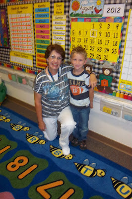 Jayden was especially excited since this was his first year. He had been in preschool for two years. Two years of only two days a week for not even three hours. Needless to say being almost six years old he was more than ready for kindergarten. He got up early and watched me pack his lunch. He said he didn't want the grapes I was packing. I informed him that in order to have the fun food he had to have grapes. And also that his teacher was going to call me to tell me if he didn't eat them....hopefully that worked. Speaking of his teacher, Jayden's teacher is Mrs. Gillette. In preschool there wasn't much structure, so I knew he needed a teacher that was fun, but would lay down the law and keep him in line.